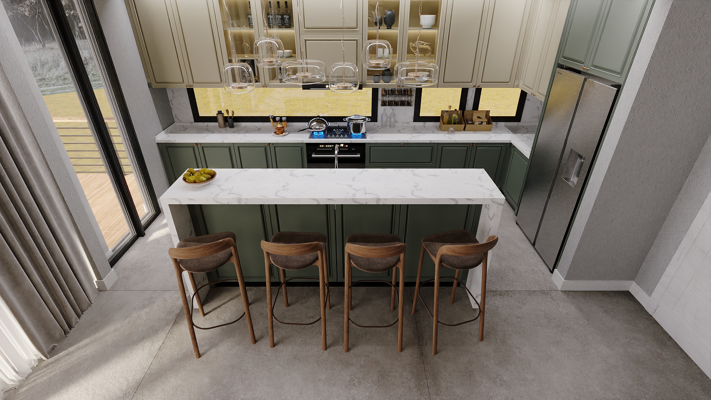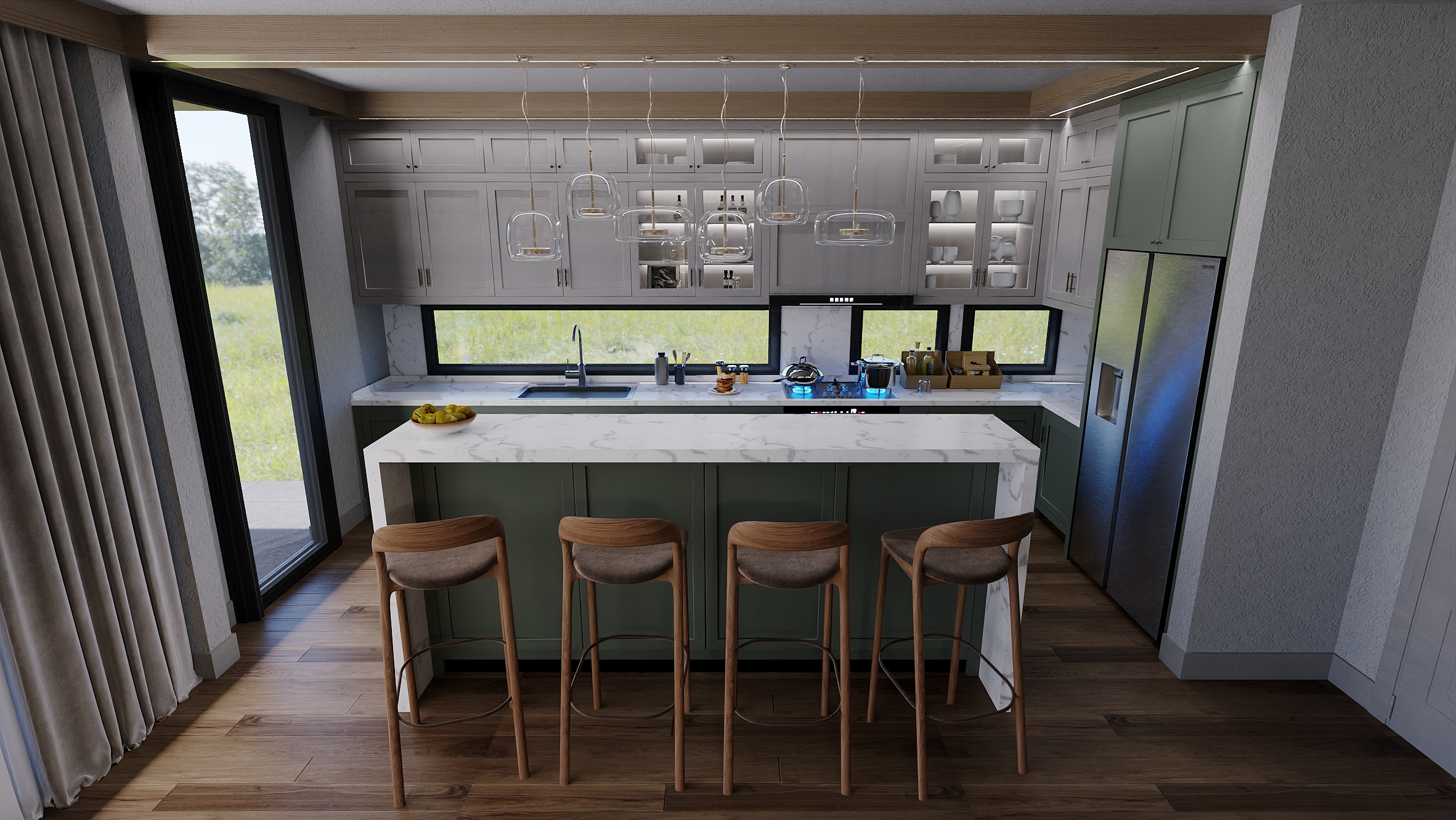 Proje tüm mekanlarda netlik, konfor ve uzun ömürlülüğe odaklanıyor: çok işlevli mobilyalar, dayanıklı yüzeyler, su ve enerji tasarruflu armatürler ile iç mekanı doğal çevresine bağlayan biyofilik bir malzeme paleti. Sonuç olarak, sakin bir günlük yaşam ve zahmetsiz hafta sonu buluşmaları için özel olarak tasarlanmış, samimi ancak havadar hissettiren rafine bir Kabin Ev iç mekanı ortaya çıkıyor.