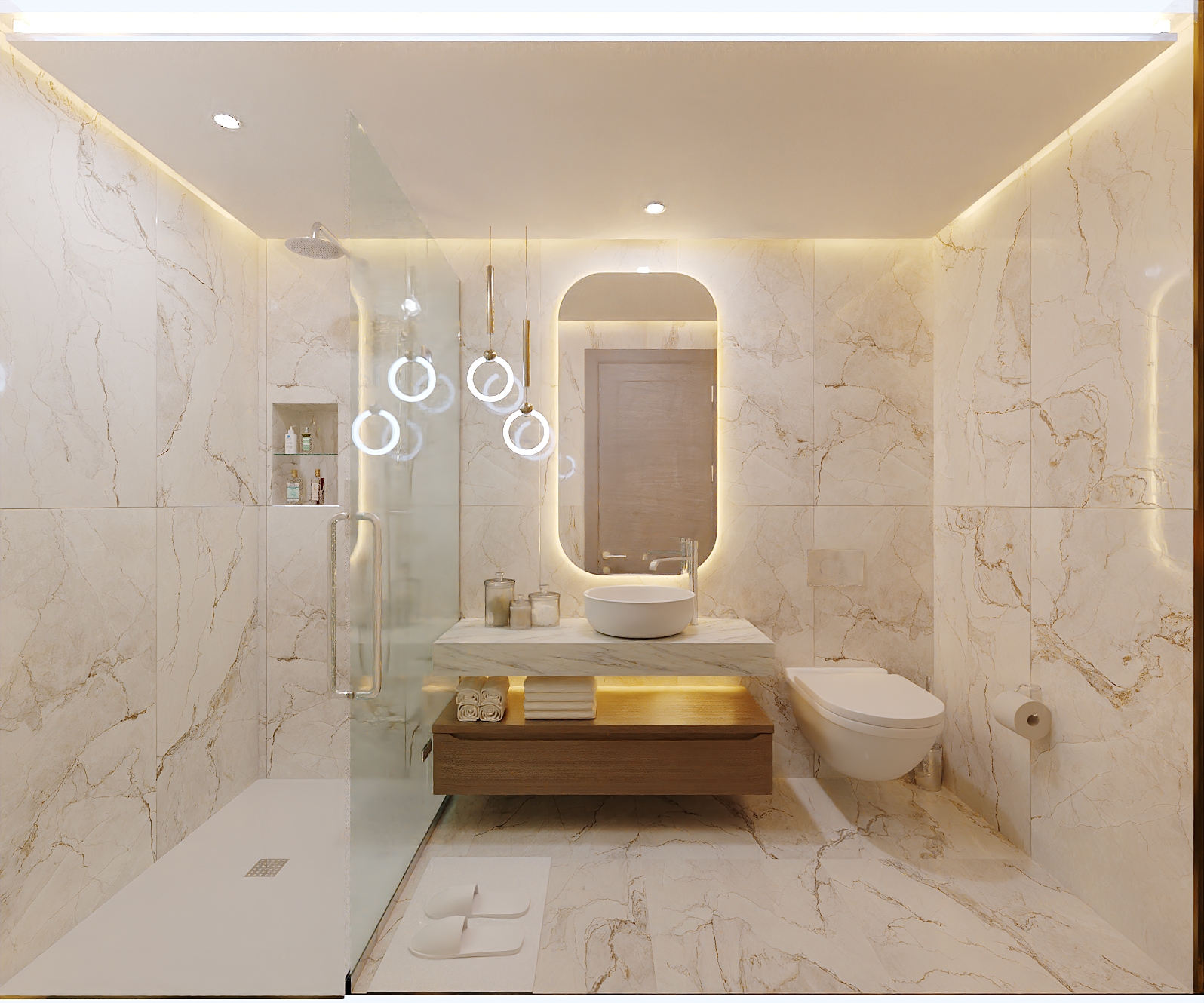 Yatak Odaları, özel üretim yatak başlıkları, entegre gardıroplar ve yumuşak akustik bitişler aracılığıyla dinlenme ve düzeni ön planda tutuyor. Banyolar, spa benzeri bir his için gizli aydınlatmayla eşleştirilen ahşap görünümlü porselen, mikrosimento ve fırçalanmış armatürlerle dayanıklılık ve dinginliği dengeliyor. Koridorlar, görsel karmaşa yaratmadan depolamayı en üst düzeye çıkarmak için nişler ve gizli dolaplar kullanılarak işlevsel galeriler olarak ele alınıyor.